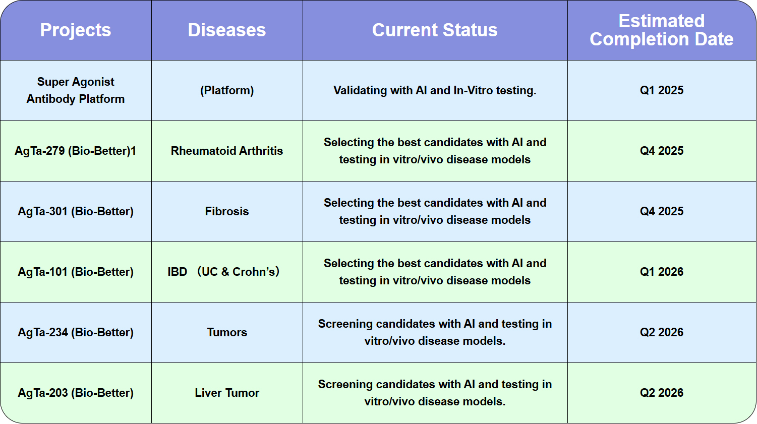 Bio-Betters Drugs are new drugs designed from existing ones with improved properties such as higher efficacy, selectivity, stability, half-life, and/or lower toxicity/immunogenicity. The projects are subject to adjustment according to validation outcomes and market competitiveness.